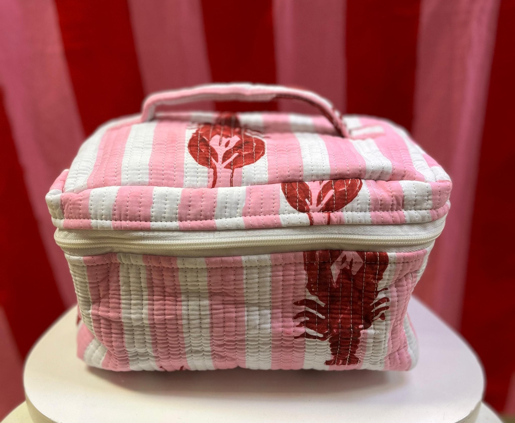 Large Handled Quilted Washbag - Pink Stripe Lobster