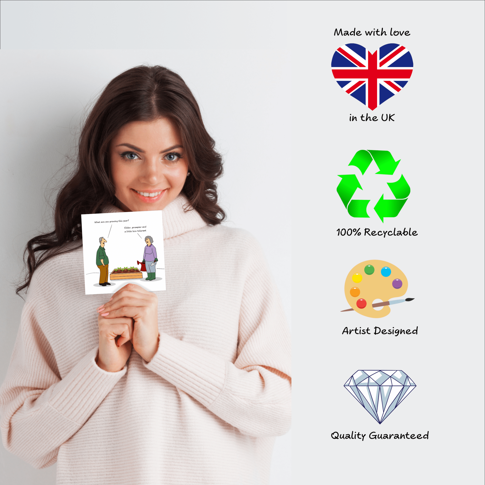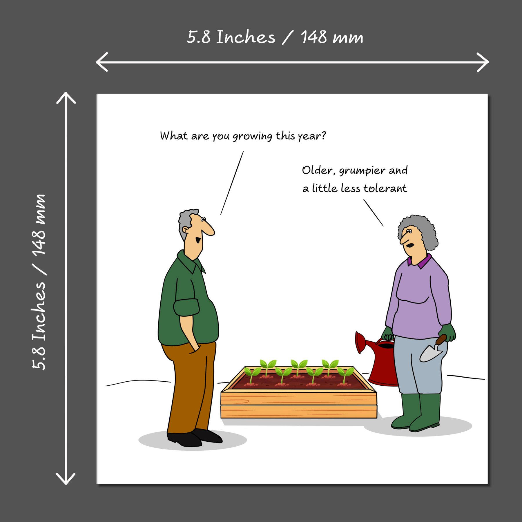 Funny Gardening Birthday Card ideal for 40th, 50th, 60th, 70th, 80th or 90th Birthday for Wife, Mother / Mum, Sister, Aunt, Granny / Grandma / Grandmother, or any female friend Amusing, humorous and fun growing vegetables / owning an allotment / gardening. Text: What are you growing this year? Older, grumpier and a little less tolerant Image: Cartoon drawing of a man talking to lady gardener in her garden Theme: Getting old / aged / age / over the hill / grey grumpier and less tolerant. This Birthday Card is blank inside for your personal special message Handmade blank card printed on high quality recycled card, complete with envelope. Content: 1 x greeting card, 1 x envelope Size: 6 x 6 inches, 152 x 152 mm Card: White premium recycled card, 300 gsm Envelope included: 100 gsm