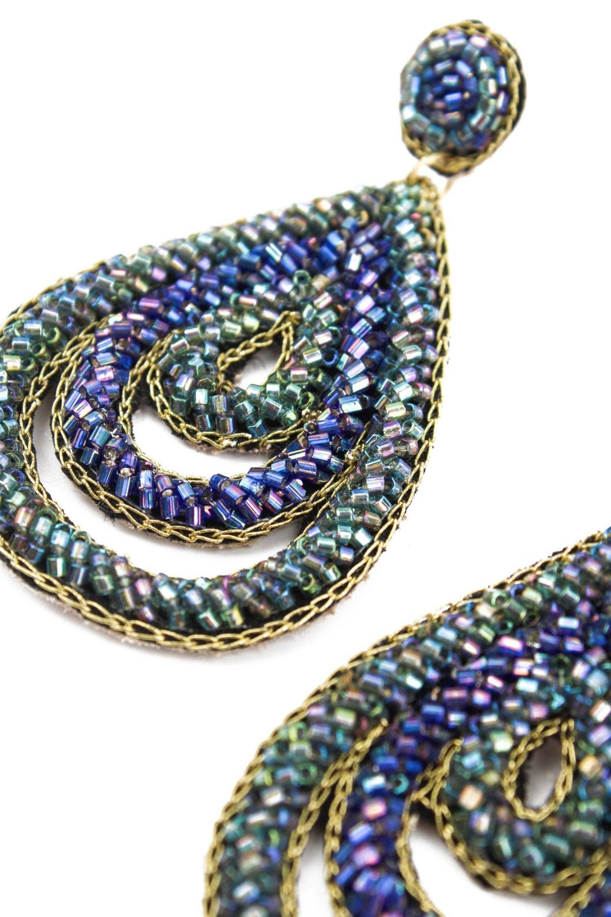These beautifully crafted earrings feature a stunning combination of blue and teal shimmering beads, creating a unique and eye-catching design.