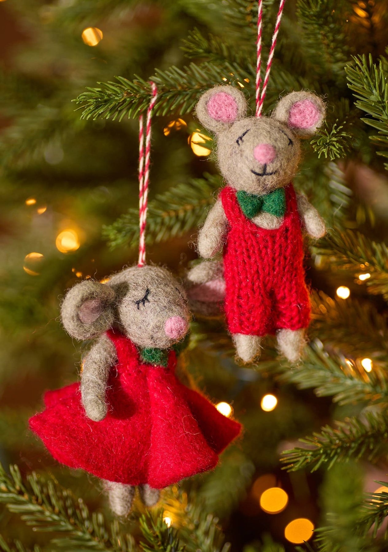Two varieties of felt mice decorations dressed in Christmas outfits and fitted with red and white hanging threads. In felt attire of a red dress or red knitted dungarees and black bow tie, these cute characters are fun festive tree additions. Part of a funky new range of sustainable eco decoration ideas designed in-house at Namaste.