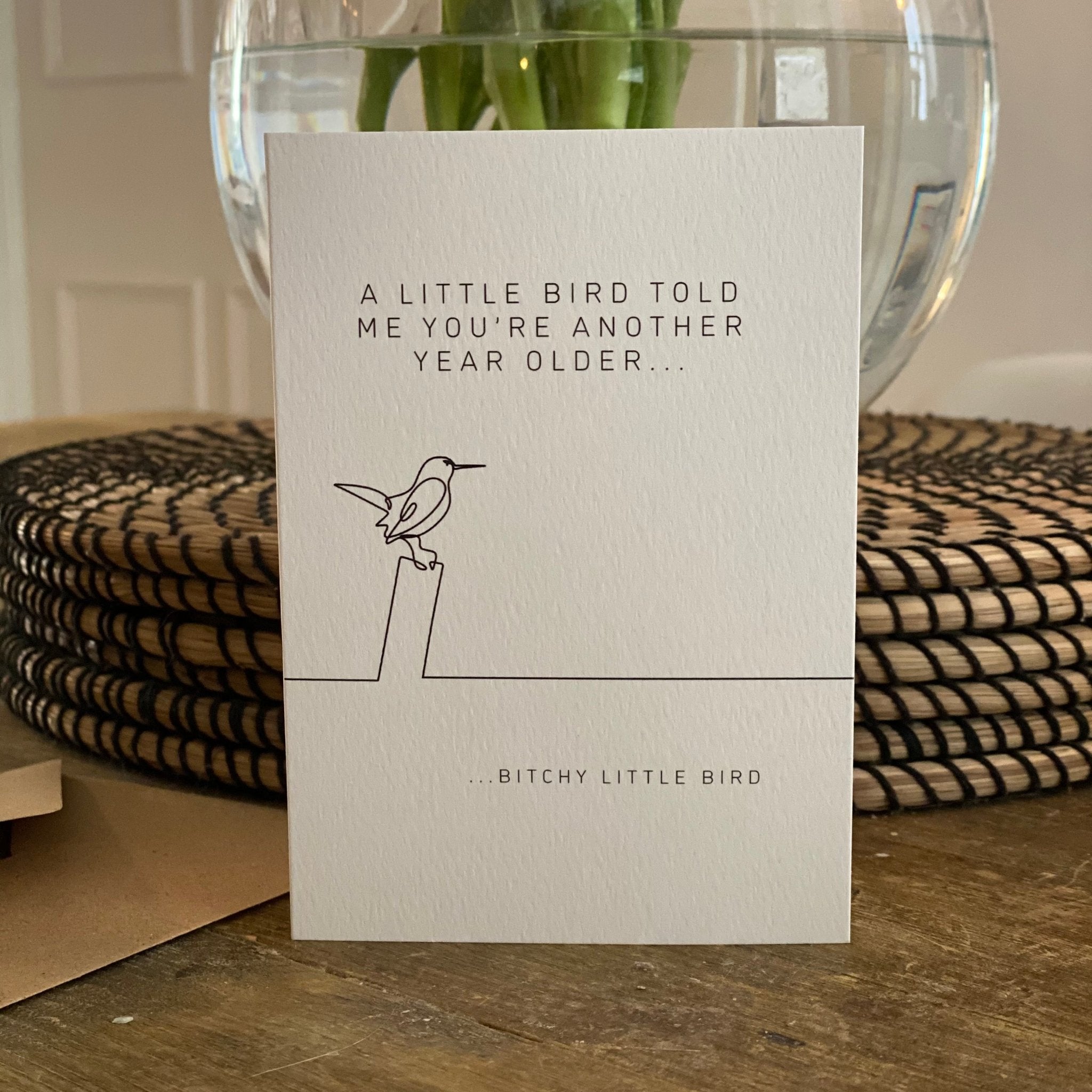 A beautiful hand-drawn card - perfect for celebrating another year on this planet but with a wry smile
