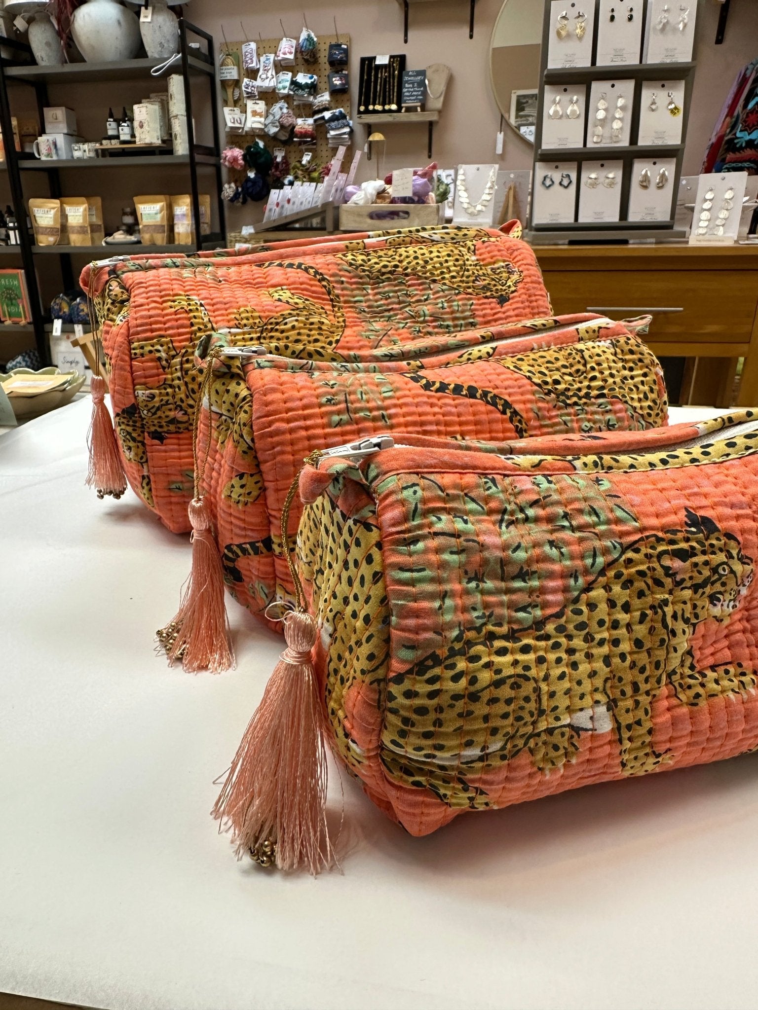 Why You'll Love It: ✨ Vibrant orange jaguar print ✨ Handmade in India using traditional techniques ✨ Soft quilted cotton outer ✨ Waterproof wipe-clean interior ✨ Internal organiser pockets ✨ Durable zip closure with tassel ✨ Lightweight yet structured ✨ Available in 3 sizes