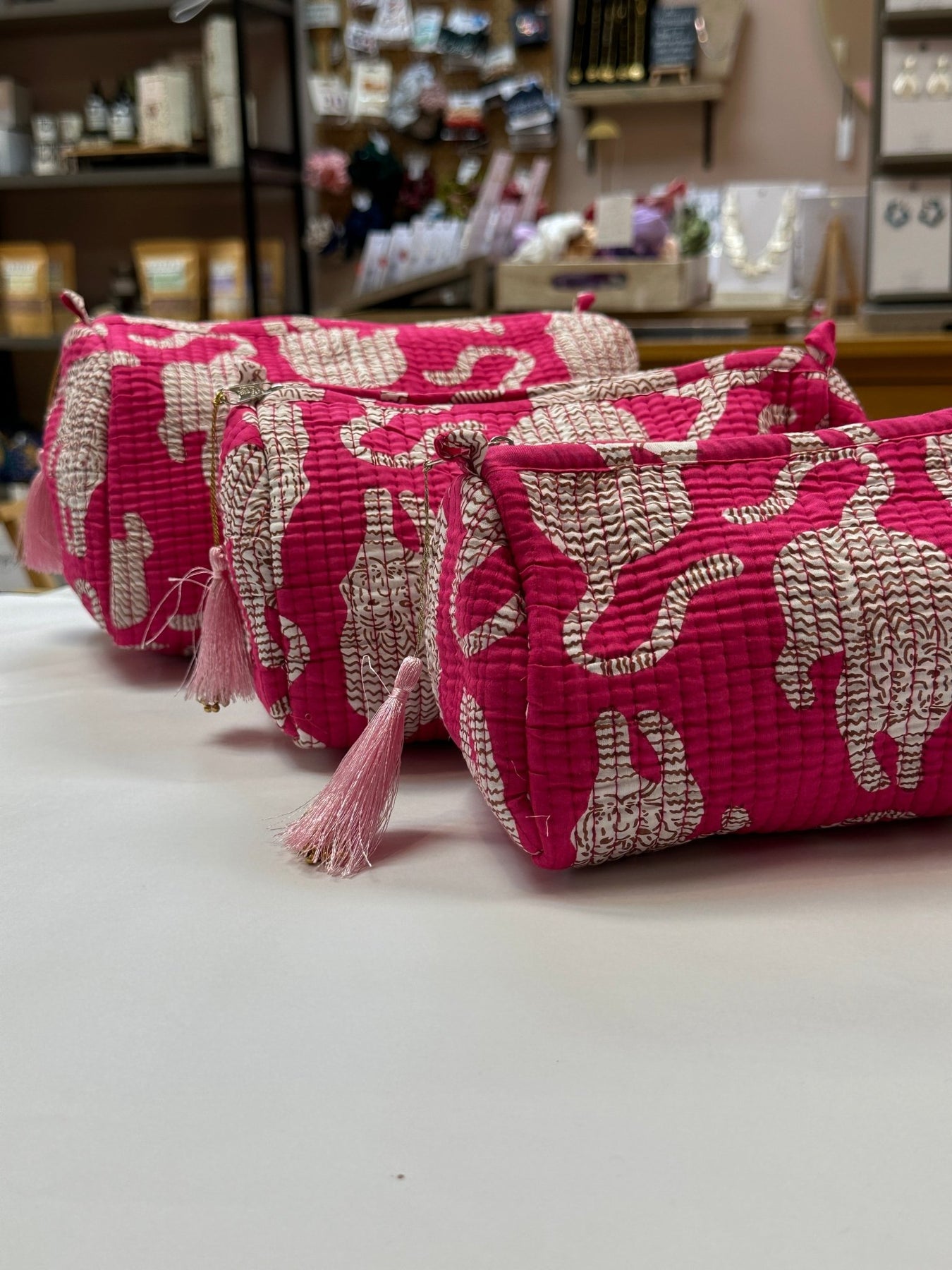 Keep your travel essentials beautifully organised with our handmade quilted cotton wash bag, crafted in India using traditional textile techniques and finished in a fun hot pink tiger print.