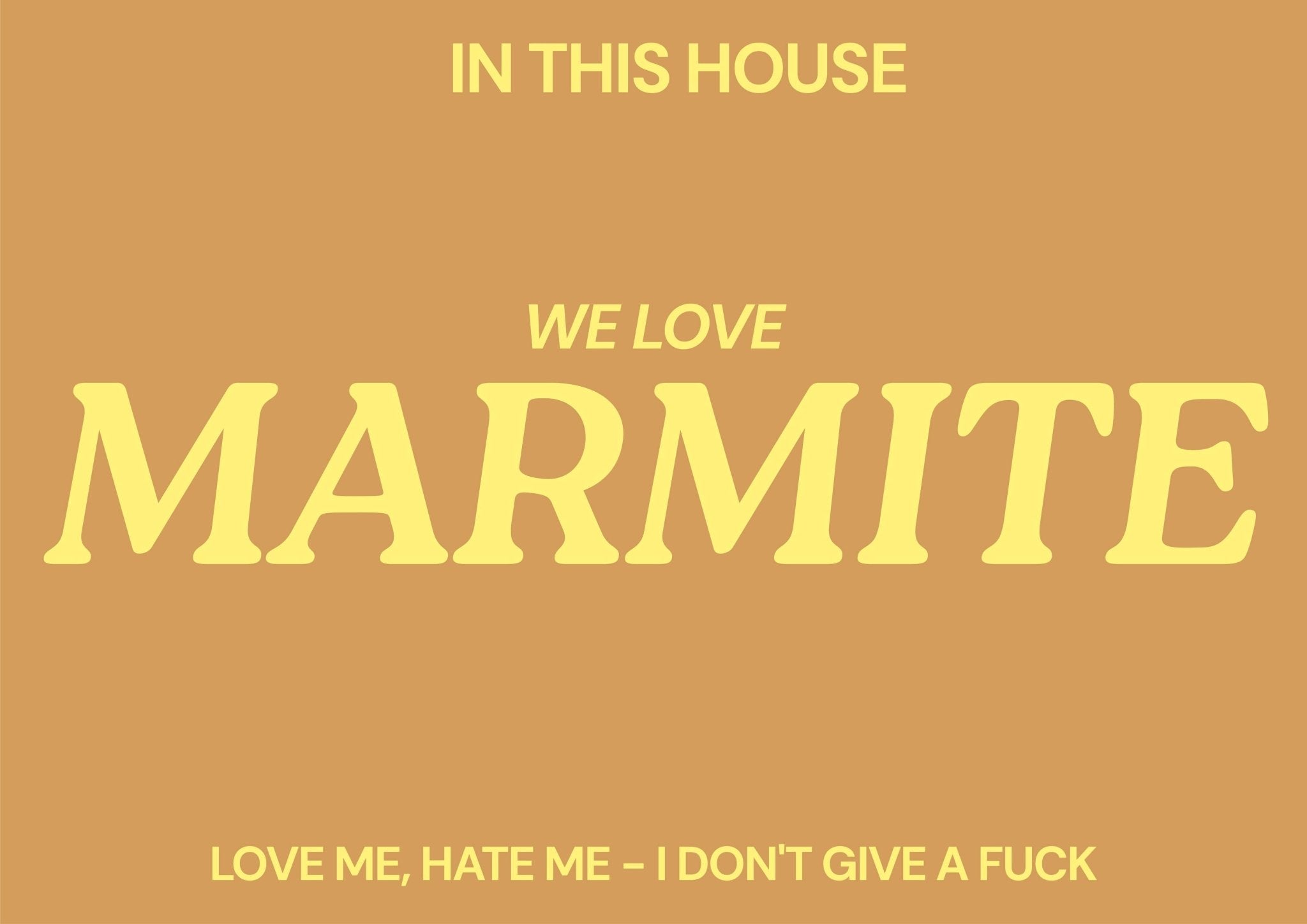In this house we love marmite - love me, hate me Printed on high quality 230gsm archival art paper. Each print is individually packed inside a biodegradeable cello bag with card backing, with a discreet logo sticker on the rear - display ready. Available in a variety of different sizes: A6 - 105mmx148mm A5 - 148x210mm | approx 6x8" A4 - 210x297mm | approx 8x12" A3 - 297x420mm | approx 12x16.5" 6 x 4 5 x 7 10 x 8 We can also provide a framing service (so prints arrived to you with frames) so please message us if you are interested in this. Note: Print comes unframed and are photographed on the product page for styling purposes. Please message if you have any further queries, we are always happy to help.
