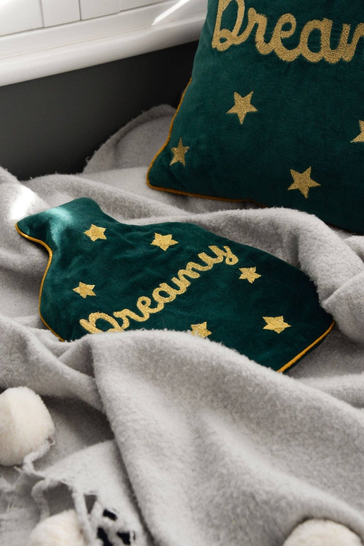 This beautiful 'dreamy' hot water bottle is embroidered in India using luxury gold thread on to plush forest green velvet. ✧ Perfect for gifting season and chilly evenings. ✧ Matching eye mask available here. ✧ Rubber hot water bottle included.