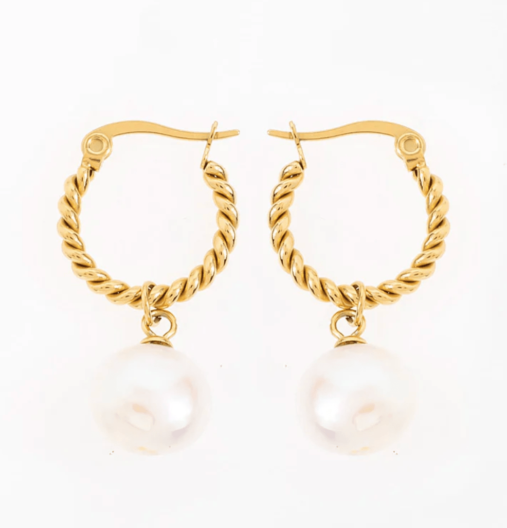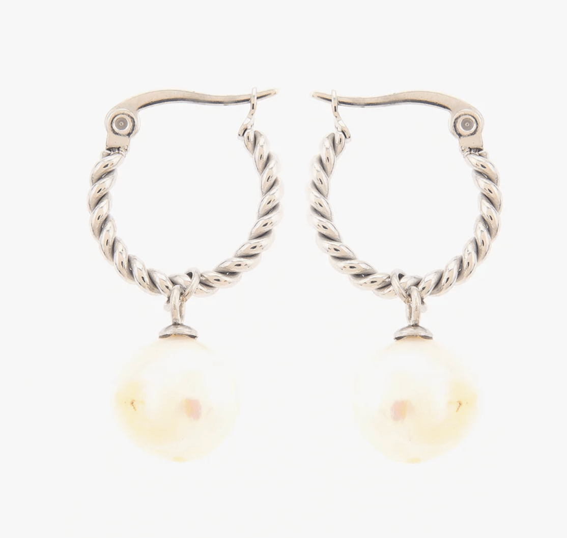 Classic with a modern edge, the Twisted Rope Pearl Hoop Earrings combine textured rope-style hoops with a luminous pearl drop for effortless elegance.