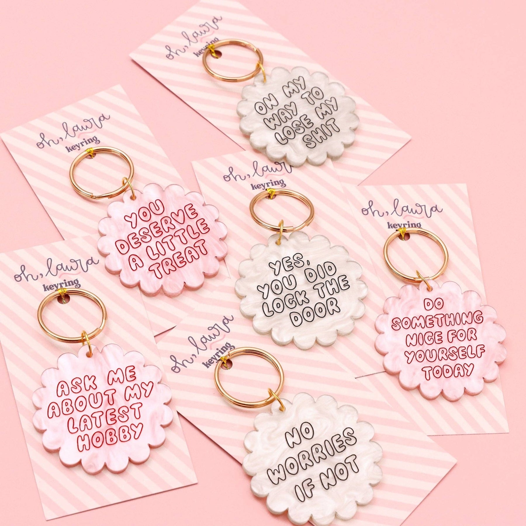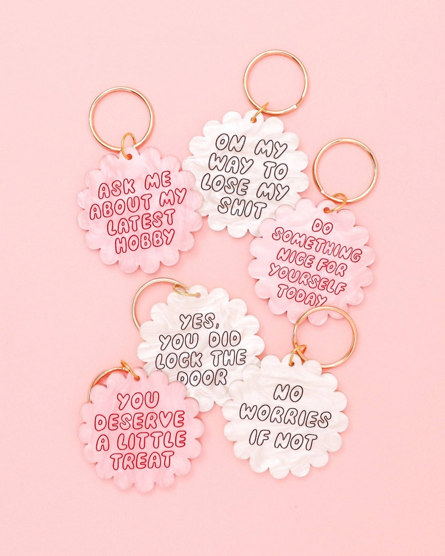 If hyperfixation had merch, this would be it. Made from pink pearl marble acrylic with bright red text, this keyring is for those of us who pick up a new obsession monthly.