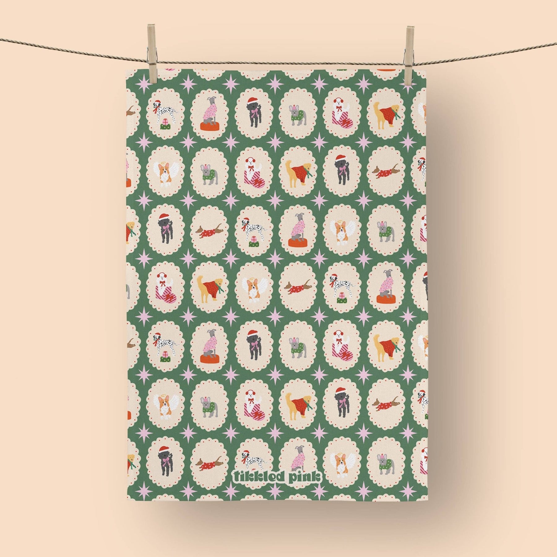 Add a touch of playful charm to your holiday kitchen with our adorable Festive Dogs Christmas Tea Towel. This high-quality tea towel features a delightful illustration of various dogs dressed in festive attire, including Santa hats, bows, and carrying gift boxes. The charming design is sure to bring a smile to your face and add a festive touch to your holiday decor.