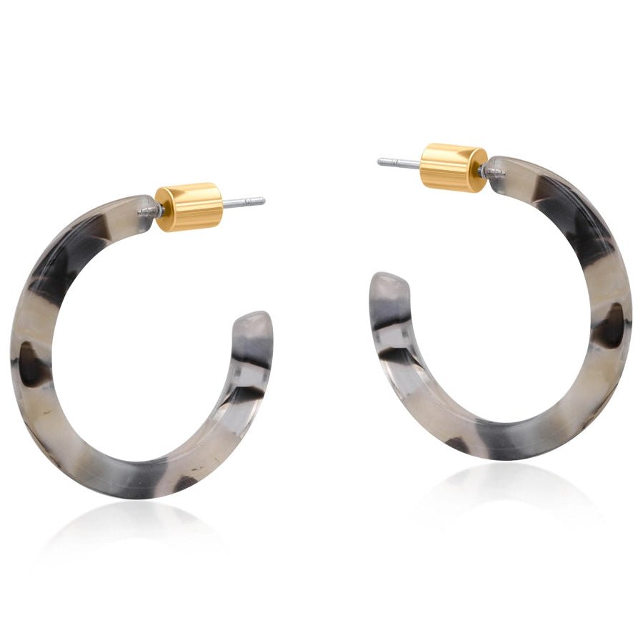 These handcrafted resin hoop earrings feature rich, marbled tones and a sleek, modern shape—bringing bold style with an elegant edge. A versatile piece that effortlessly elevates casual and polished looks alike, they offer a refined take on contemporary accessorising. Each pair is handmade using sustainable resin, recycled from leftover materials from glass frame production. This upcycled process creates distinct patterns that make every pair unique. All posts are hypoallergenic, made from surgical steel.