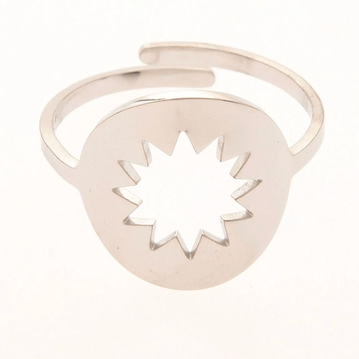 Clean, modern and effortlessly wearable, this sun cut-out adjustable ring brings a subtle celestial touch to everyday styling. Featuring a smooth circular face with a crisp sunburst cut-out at the centre, it has a contemporary, minimalist feel that works beautifully worn alone or stacked.