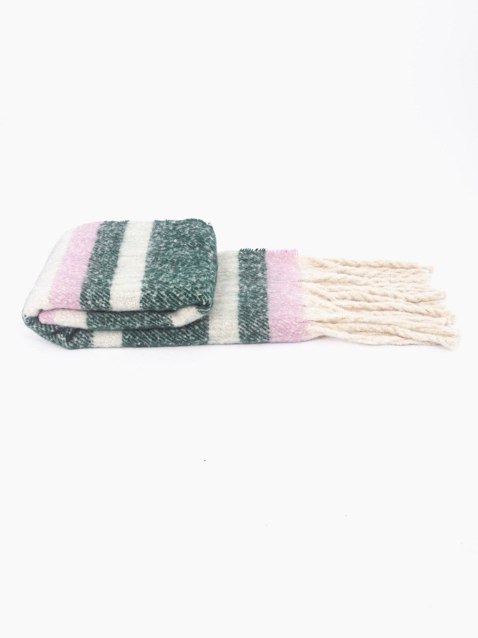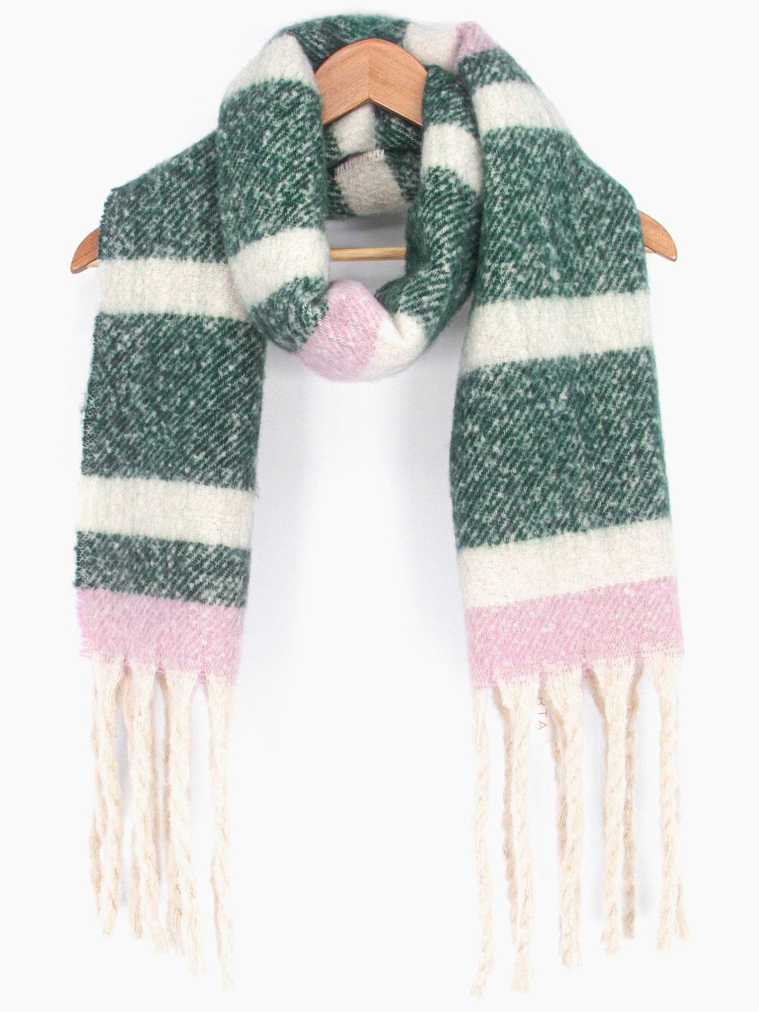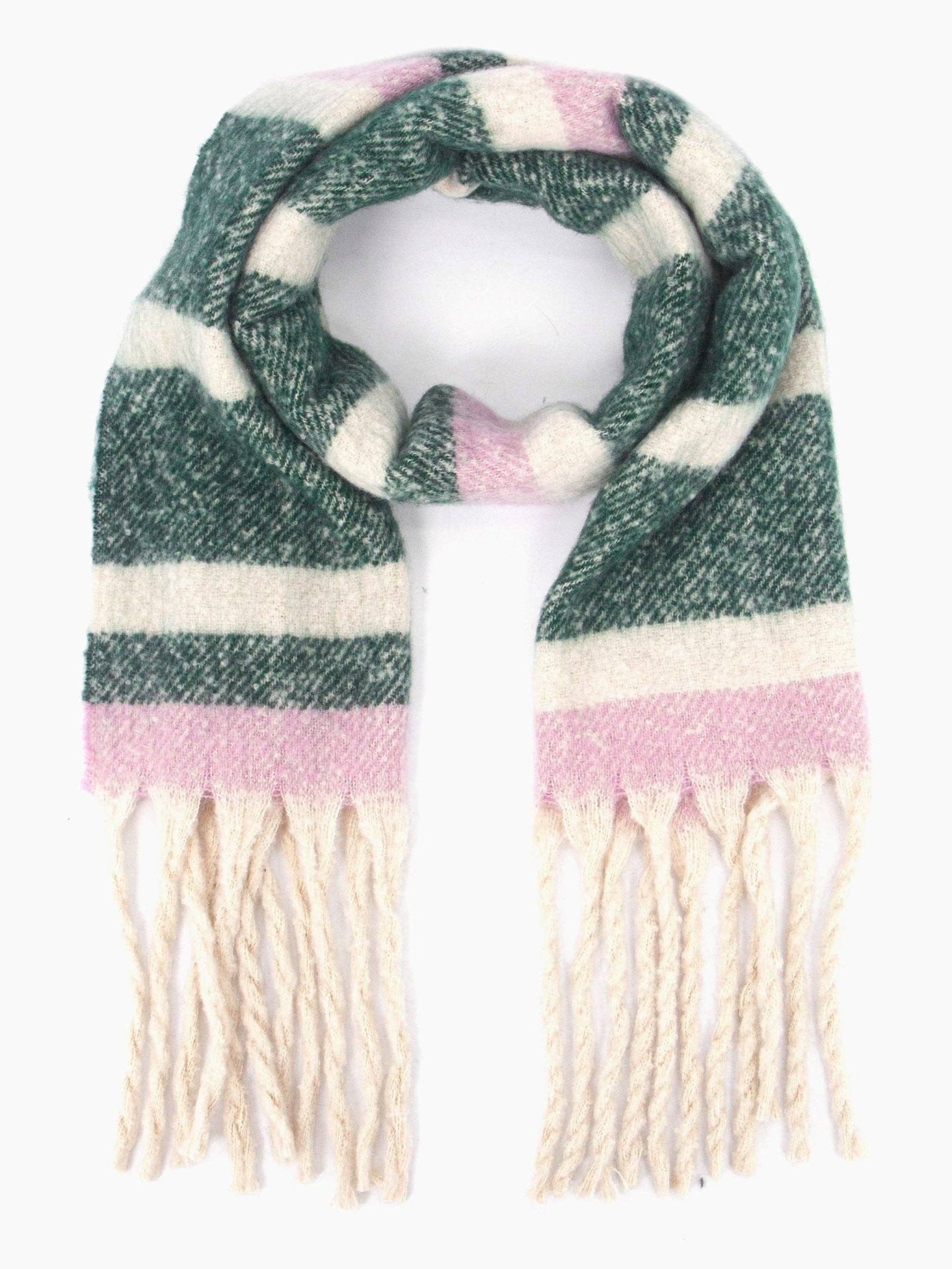 A classic striped winter scarf crafted from soft knitted viscose. Showcasing contrasting horizontal stripes and a bohemian-influenced tasselled fringe. Designed for warmth, this scarf can be effortlessly paired with outdoor winter attire.