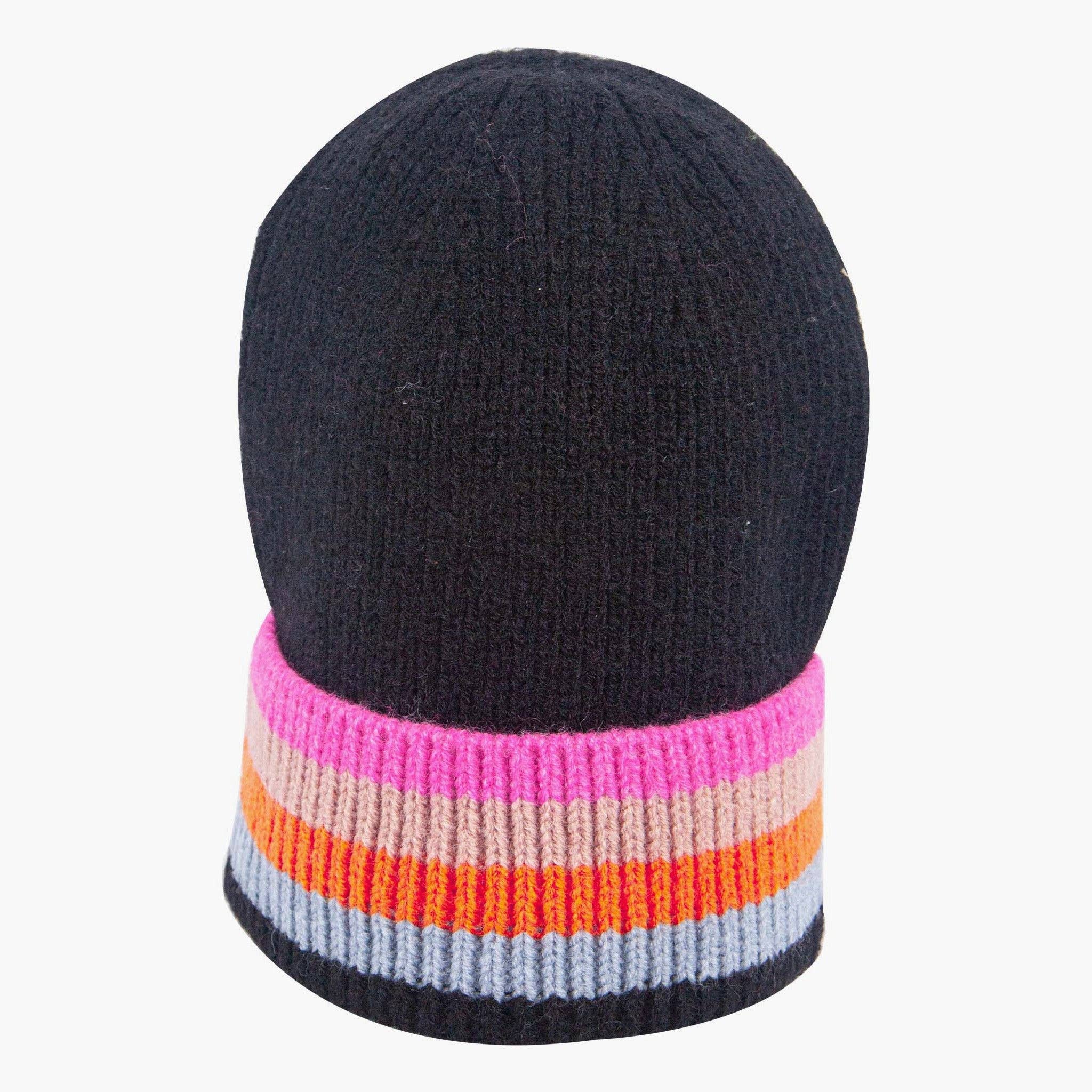 A contemporary knitted winter beanie hat with a multicoloured striped rim. Crafted from warm blended acrylic yarn, this ribbed winter hat is designed to keep you feeling cosy.