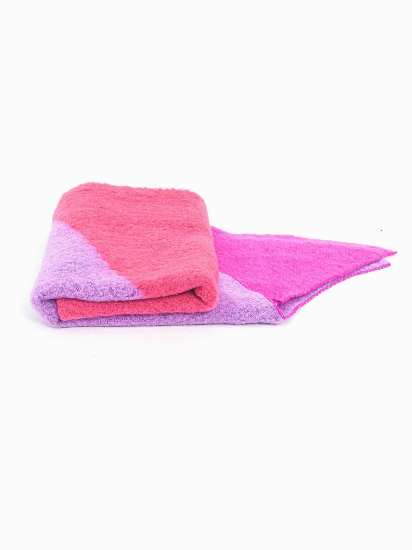 A heavyweight winter scarf, crafted from soft, textured viscose. Designed for warmth, this asymmetric scarf showcases a bold contrasting lilac and pink colour block design.