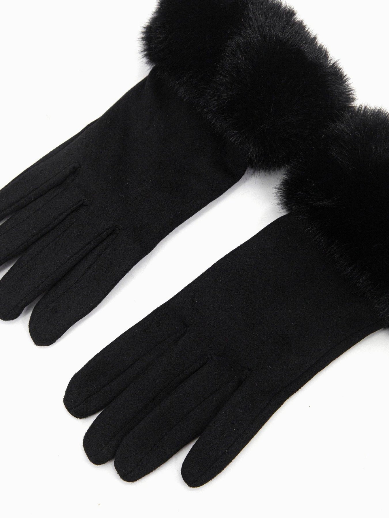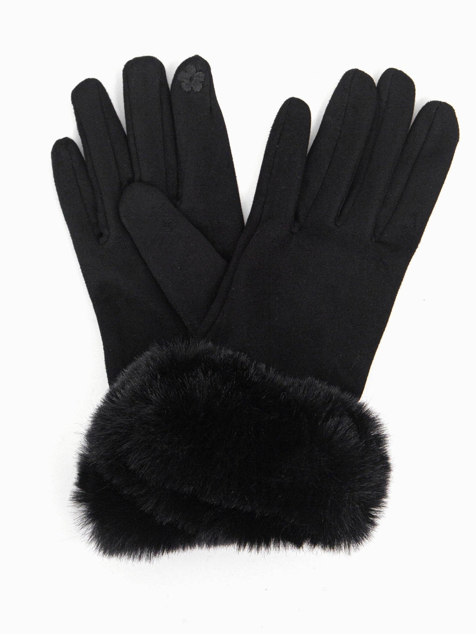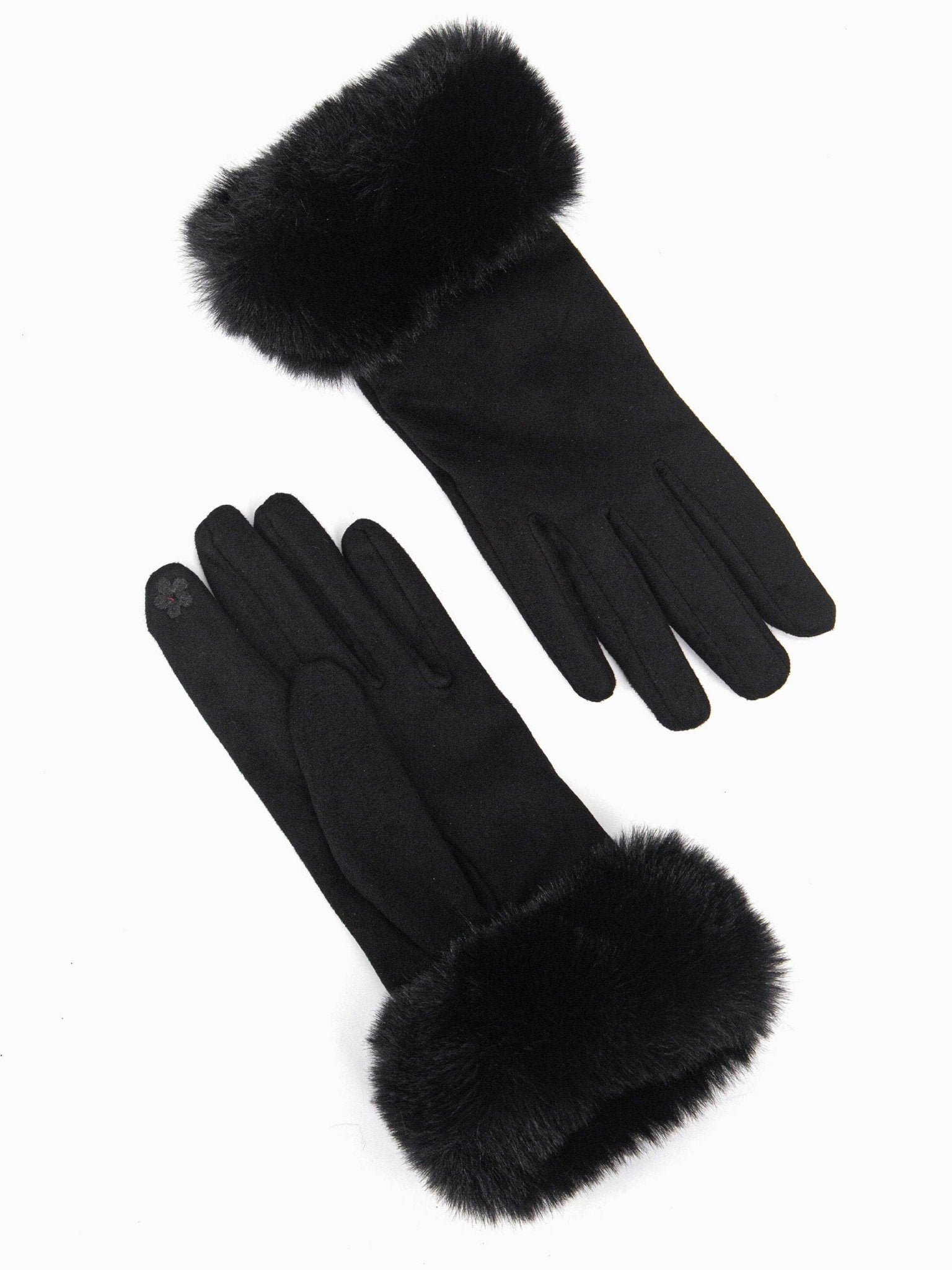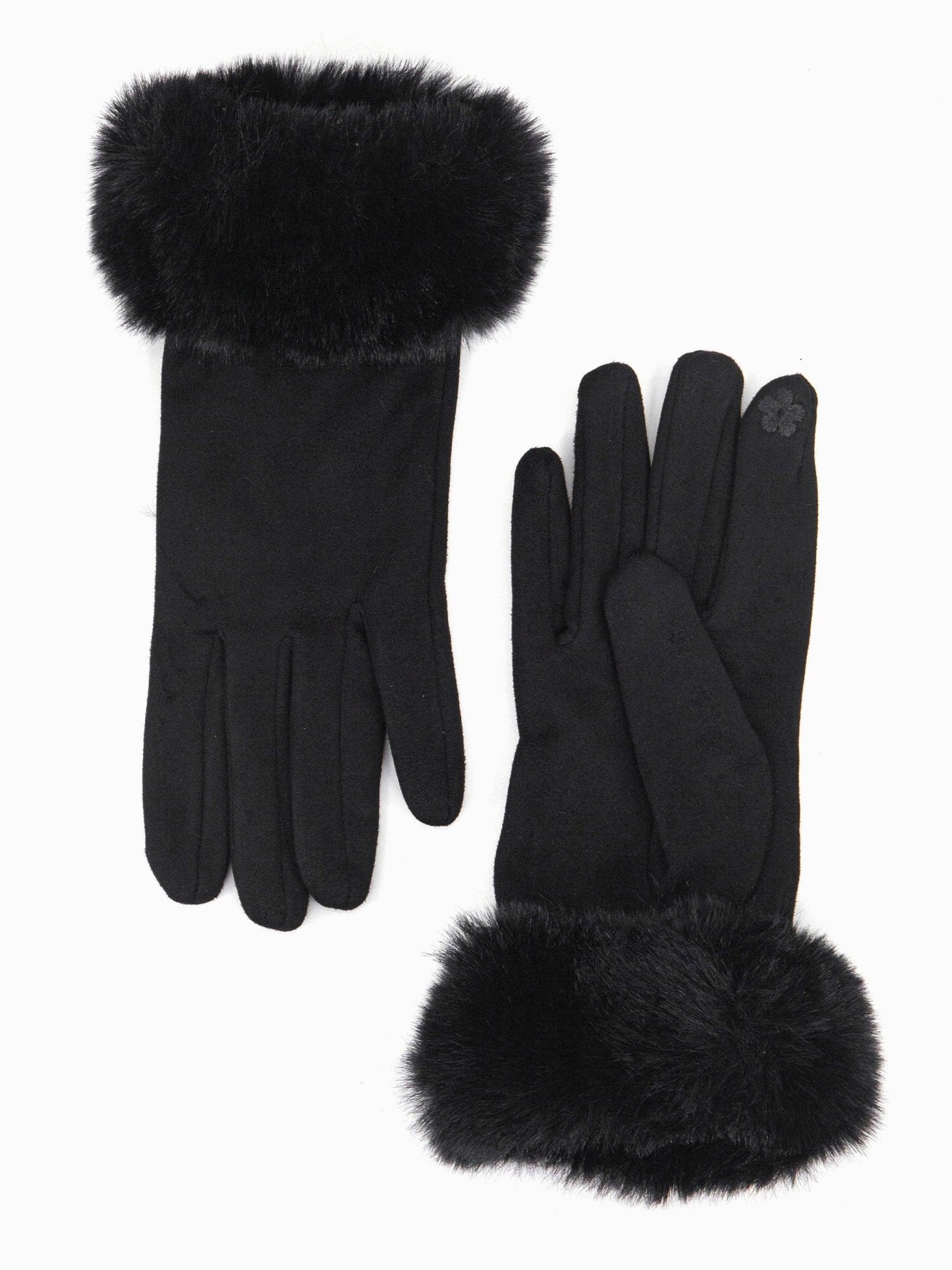 Black winter gloves crafted from a soft velvet textured polyester. Touch screen compatible, these gloves can be worn while using any mobile device. Featuring a comfortably designed faux fur cuff