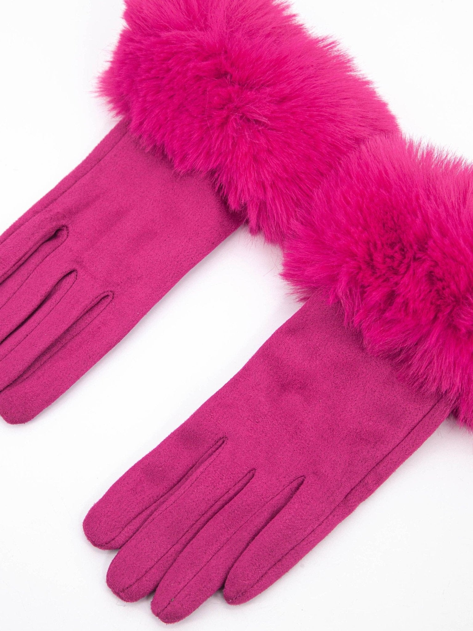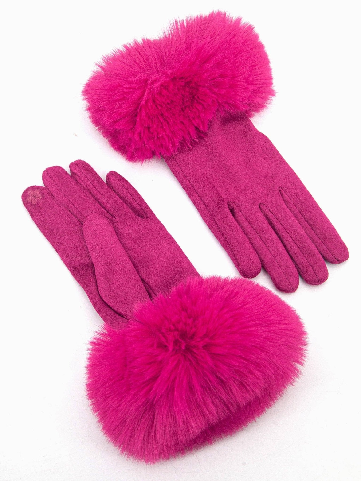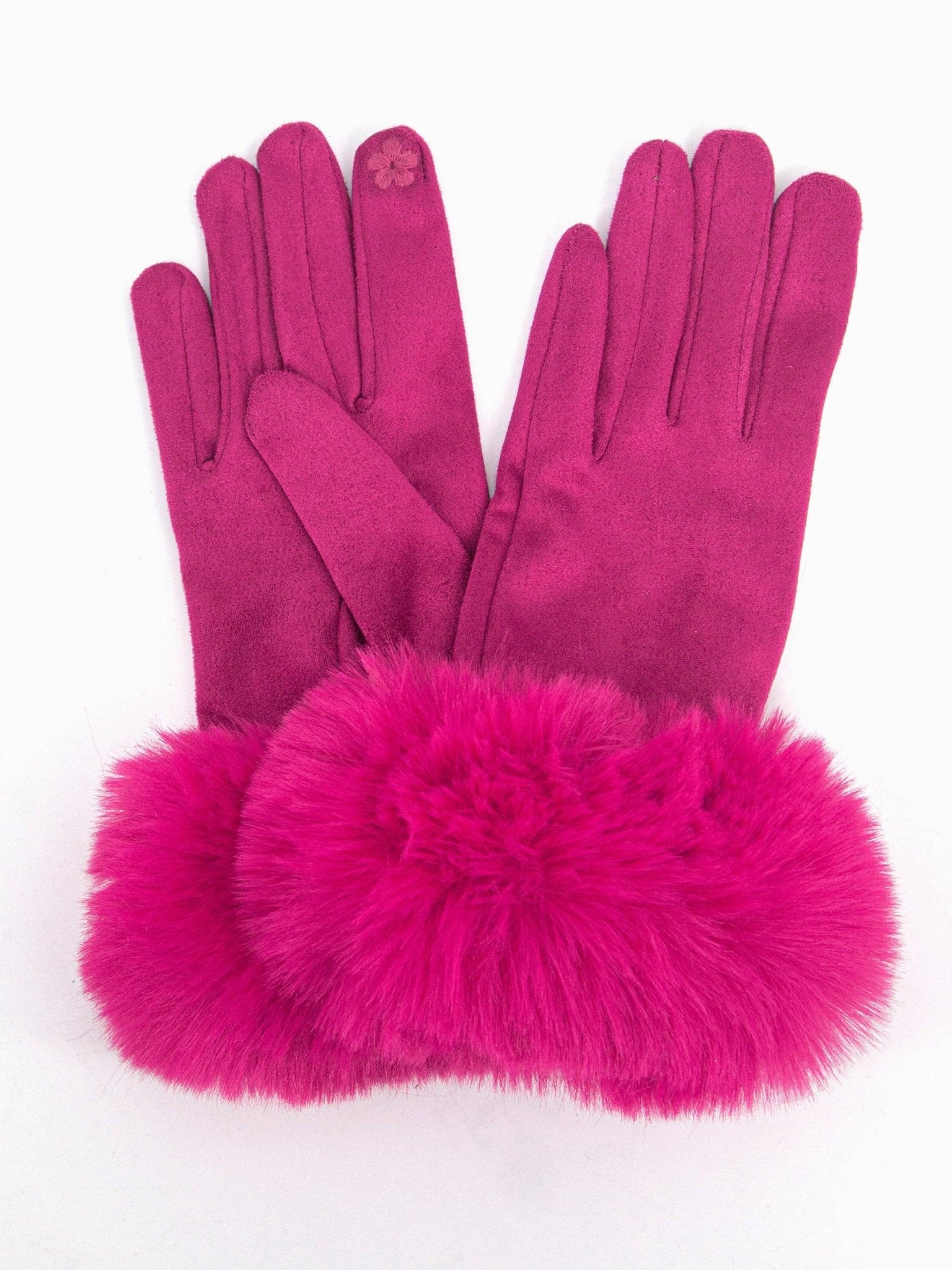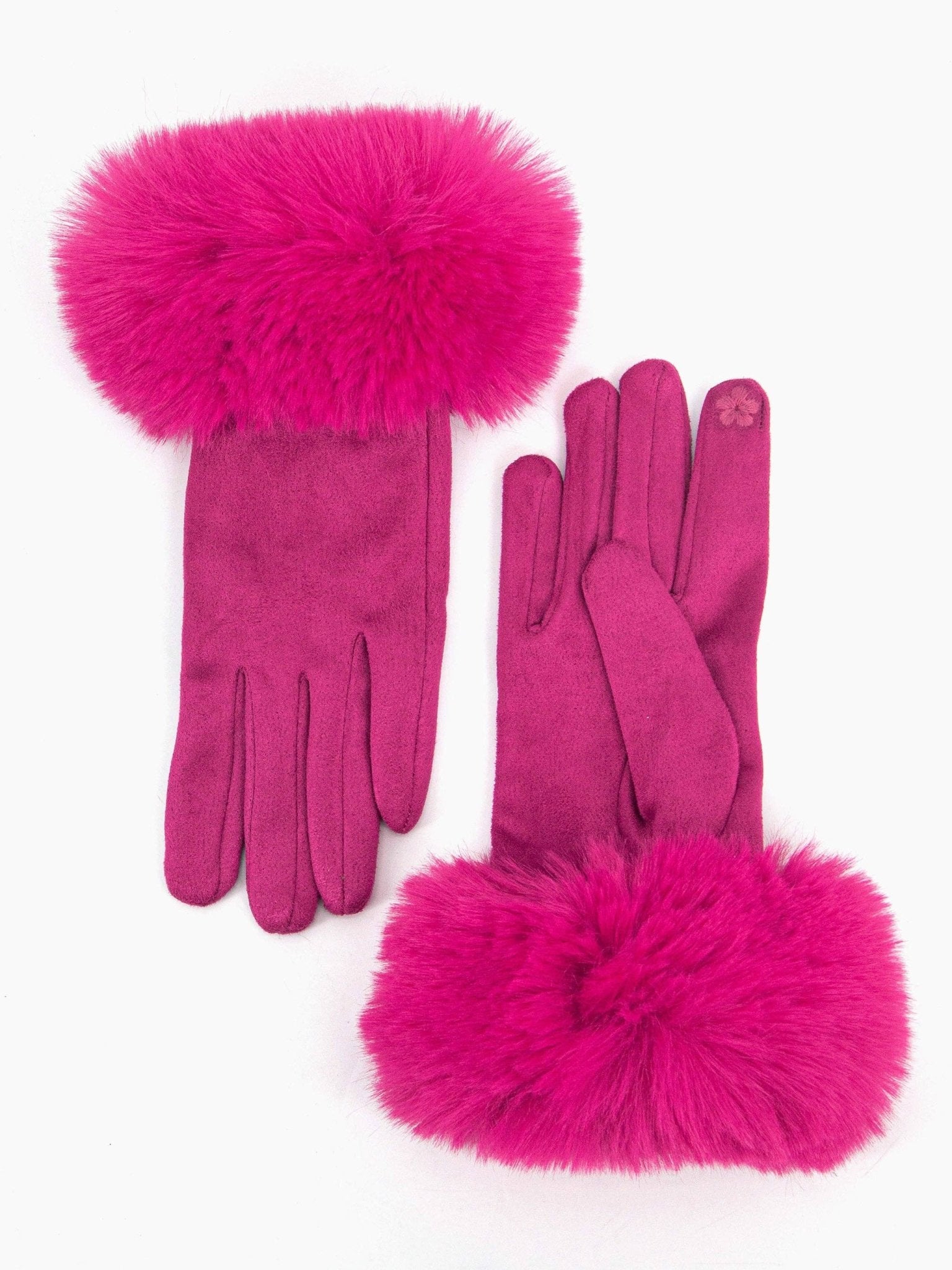 Fuchsia pink winter gloves crafted from a soft velvet textured polyester. Touch screen compatible, these gloves can be worn while using any mobile device. Featuring a comfortably designed faux fur cuff