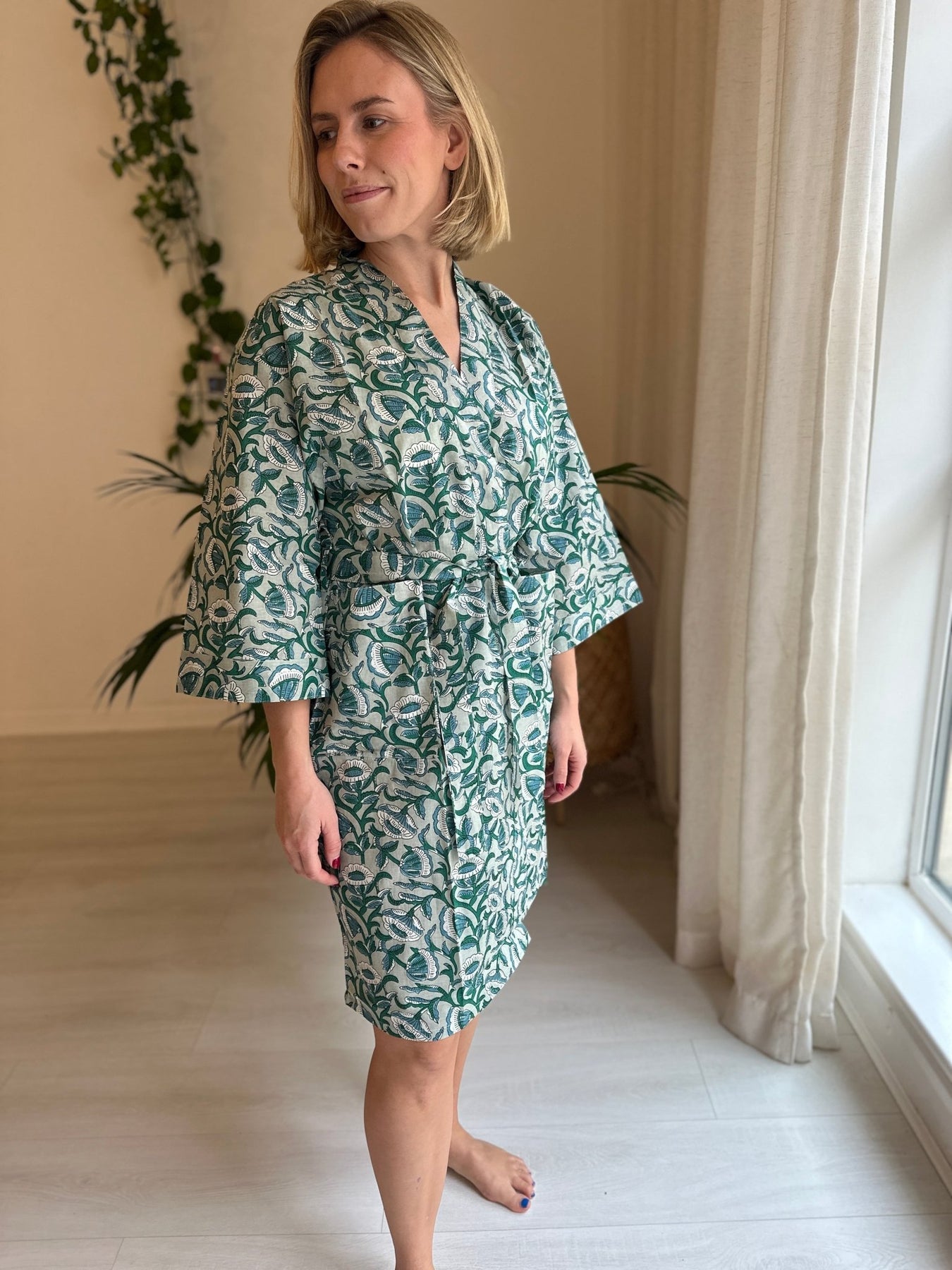 Relax in soft, artisanal style with our Green Floral Block Print cotton kimono dressing gown. Crafted from 100% breathable cotton and handmade in India, this robe features a beautifully intricate floral pattern created using traditional block printing techniques — giving each piece unique character and charm.