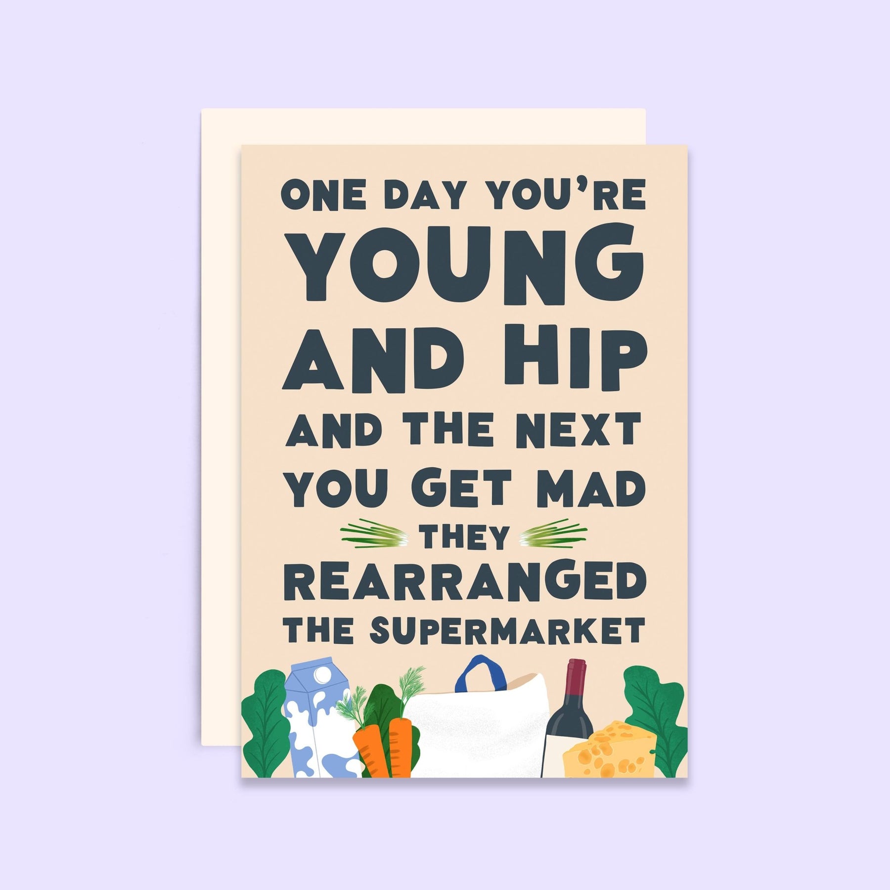 This funny birthday card is the perfect gift for someone who’s getting on in years and becoming disgruntled by change. For example, the block text caption on the birthday card identifies one of the most annoying changes: “One day you’re young and hip and the next you get mad they rearranged the supermarket.” Come on, how are they supposed to find anything now? Direct from the design studio of UK-based paper products brand, Tikkled Pink, this new funny birthday card is one of many relatable greeting cards that spread joy on milestone and everyday occasions.